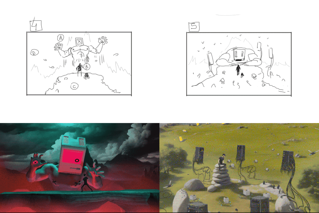 When we went for the production process, we first transformed our hand-painted concept scenes into 3D models to set some boundaries. Next, we used AI to refine the overall look and feel. Using Leonardo, we curated a roundup based on multiple output iterations. Finally, we returned to Photoshop to fine-tune the assets and prepare them for the next phase.